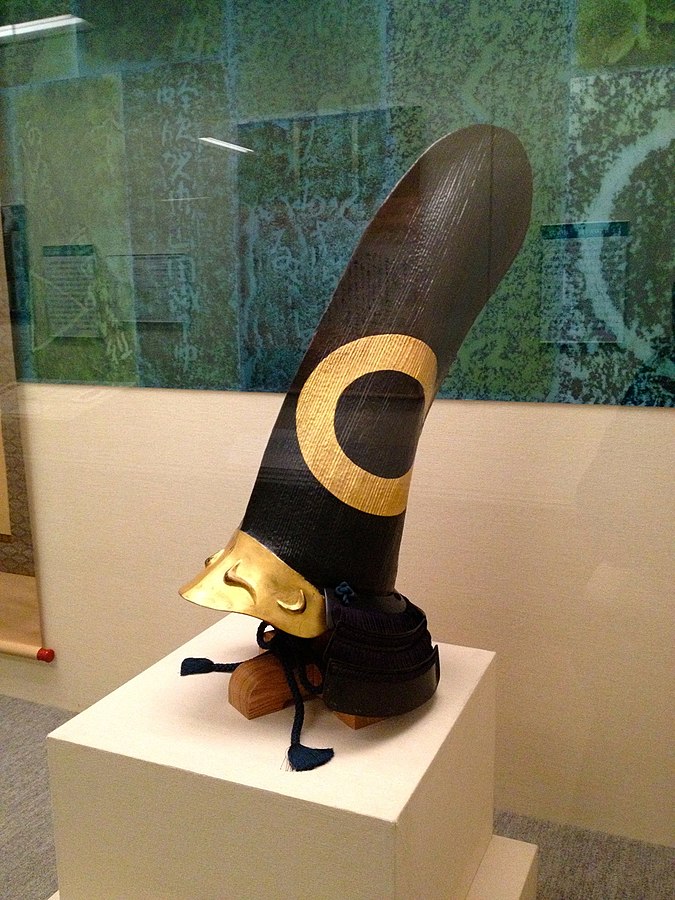 縦に長くその両面に蛇の目紋を金箔押ししてある変わり兜を着用していた。
