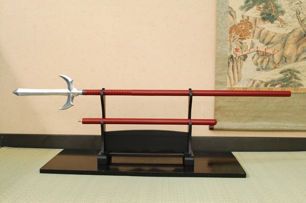 朱色の十字槍。矛先が十文字になり、敵を突く、引っ掛ける、払うなどができた。九度山の善名称院に幸村所用の十文字槍の矛先が残っている、